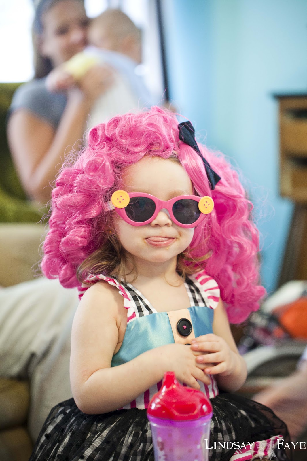 | i tried to use whatever i had in the house from other parties and such. the girls received the la la loopsy doll house for Christmas so that took a big chunk of decorating out and easy! my mom has several sewing machines and her travel vintage singer was at my house with her so i drew a dress and pulled out fabrics i bought in new york 3 years ago and my awesome mom whipped a la la loopsy dress for the birthday girl, and her awesome aunt had bought her the wig on clearance at target after Christmas then the sewing machine became part of the decor. |